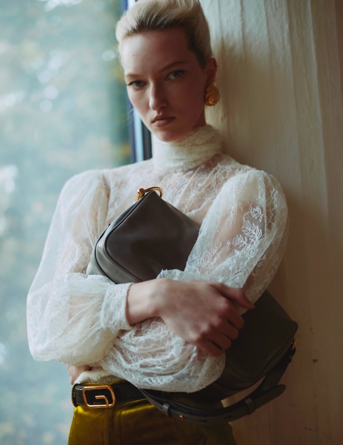 Thiết kế là sự hòa quyện giữa tinh thần vương giả cổ điển và tư duy thời trang hiện đại, nổi bật với tay bồng cỡ lớn và cổ cao kín đáo gợi nhắc thời kỳ Victoria. ẢNH: GUCCI