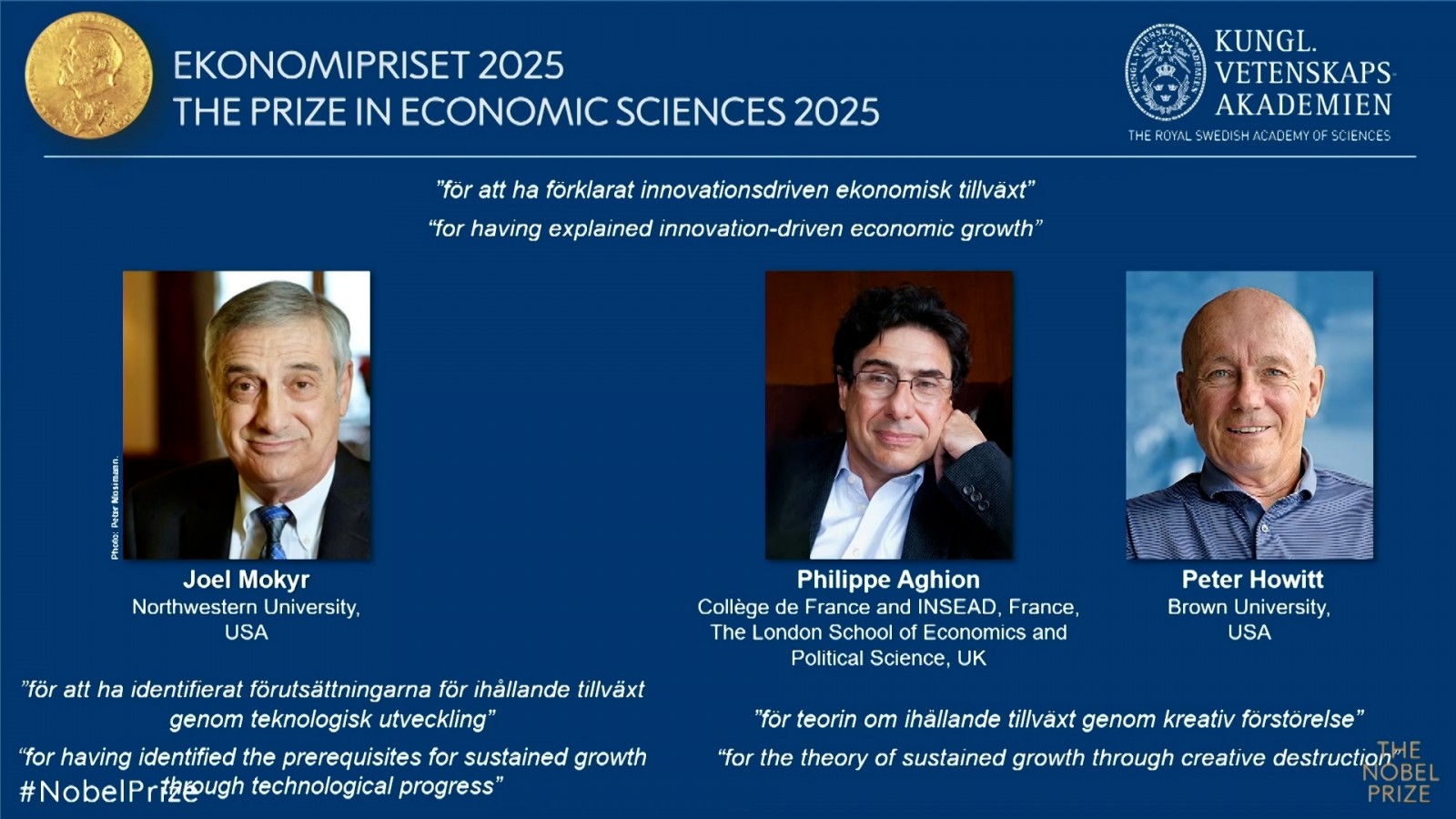 - Chiều 13/10 theo giờ Hà Nội, Viện Hàn lâm Khoa học Hoàng gia Thụy Điển đã công bố Giải Nobel Kinh tế 2025. Theo đó, giải thưởng đã được trao cho 3 nhà kinh tế học Joel Mokyr, Đại học Northwestern, Mỹ, Peter Howitt, Đại học Brown, Mỹ và Philippe Aghion, Trường Kinh tế và Khoa học Chính trị London, Vương quốc Anh, nhờ nghiên cứu về tác động của công nghệ đối với tăng trưởng kinh tế bền vững.