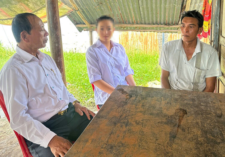 Đại diện chính quyền địa phương đến thăm hỏi, động viên em T.A (giữa). Ảnh: ÚT CHUYỀN