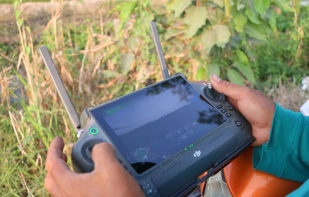 Drone được lập trình sẵn nên việc sạ lúa, bón phân, xịt thuốc đều rất nhanh và chính xác, giúp bà con nông dân chủ động thời gian, mang lại hiệu quả tốt hơn. Ảnh: Công Mạo-TTXVN