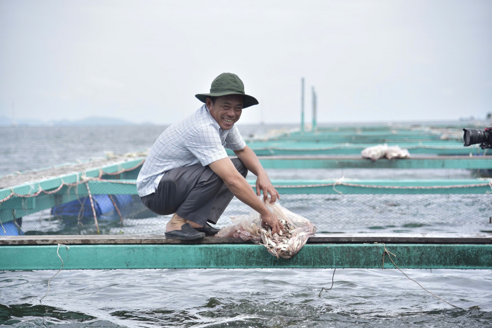 Ngồi trên tàu ra thăm hòn Nhum Bà, lồng bè của ông Trung trải dài trên biển mênh mông như một bản đồ thủy sản giữa đại dương xanh thẳm. Những bè kẽm lắp composite nổi lên giữa sóng nước, xen kẽ các loại cá đủ màu sắc tung tăng bơi lội. Gió biển thổi lồng lộng, mặt nước nhấp nhô phản chiếu ánh nắng chói chang, tạo nên cảnh tượng vừa hùng vĩ, vừa thanh bình.