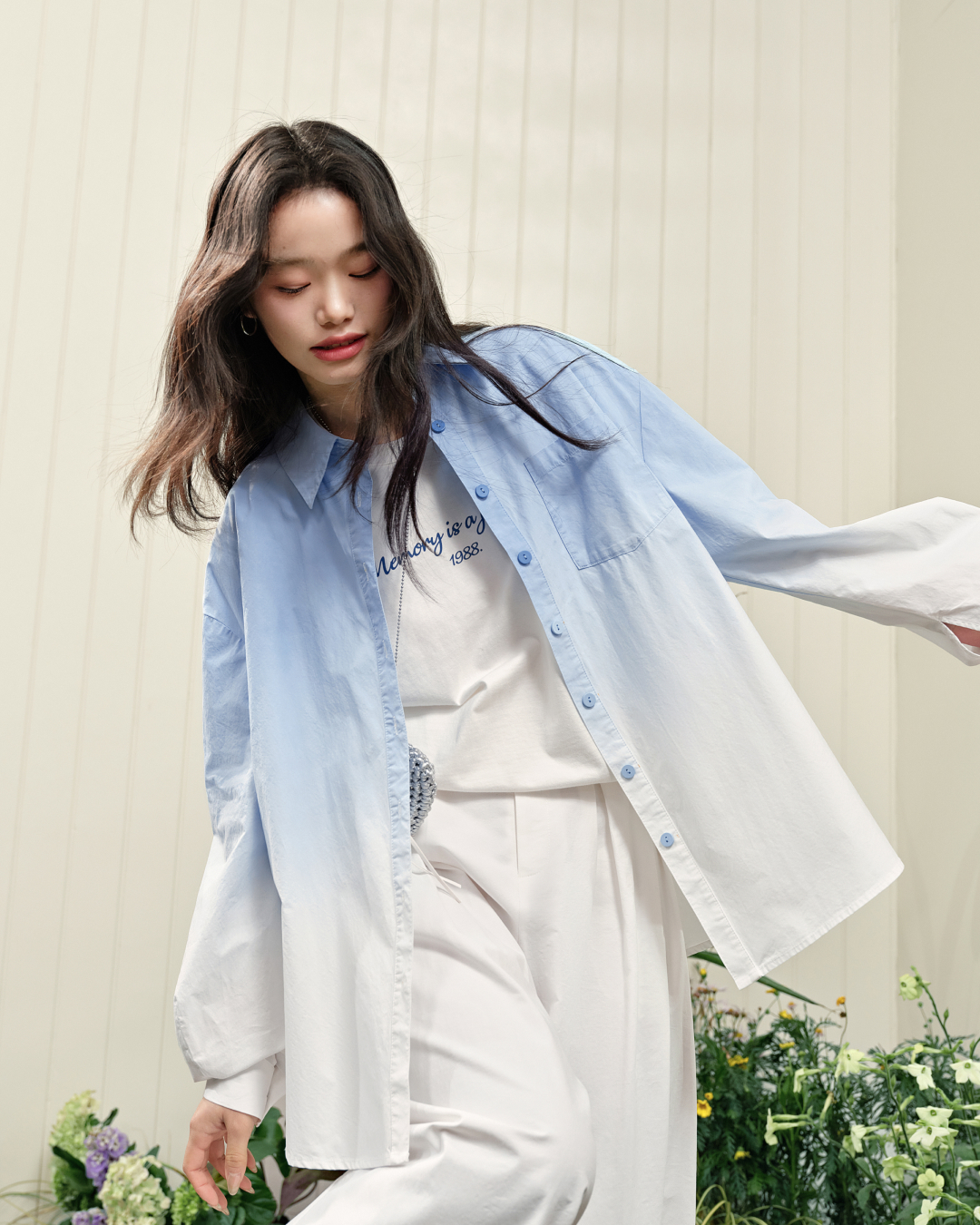 Với những ngày muốn thoải mái nhưng vẫn giàu tính thẩm mỹ thì chiếc áo sơ mi oversized khoác ngoài trang phục sẽ dễ dàng đáp ứng nhu cầu của phái đẹp. Chiếc áo mang hiệu ứng chuyển màu xanh baby sang trắng như làn sương tan, tạo cảm giác nhẹ nhàng. Kỹ thuật loang được xử lý rất tinh tế ở phần thân áo và tay áo, giúp bề mặt vải có chiều sâu mà không gây rối mắt. Bên trong, áo thun trắng in chữ kết hợp quần suông trắng đồng điệu tạo nên lớp nền trung tính hoàn hảo, làm nổi bật lớp sơ mi loang màu bên ngoài.