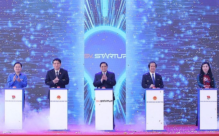 Thủ tướng Chính phủ Phạm Minh Chính và đại diện các bộ, ban, ngành, đoàn thể ấn nút khai mạc Ngày hội Khởi nghiệp quốc gia của học sinh, sinh viên lần thứ IV.