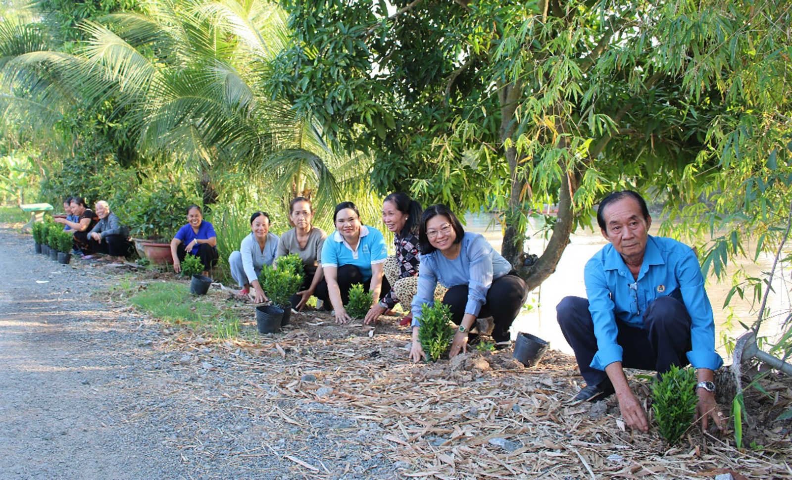 Cán bộ, hội viên phụ nữ cùng đoàn thể trồng cây xanh thực hiện công trình “Đoạn đường phụ nữ tự quản không rác thải” tại xã Vĩnh An.