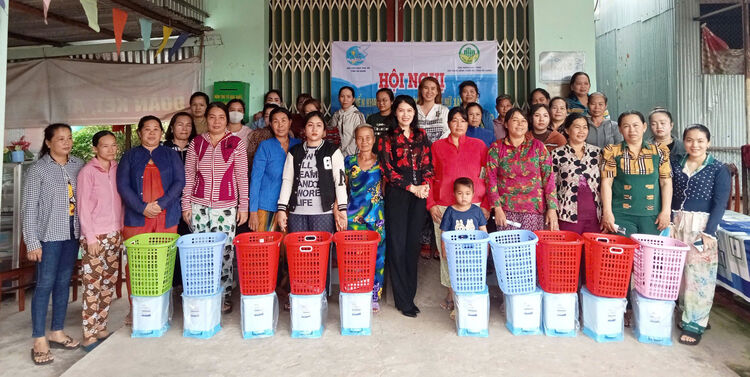 Phó Chủ tịch Thường trực Hội Liên hiệp Phụ nữ, Trưởng Ban Công tác Phụ nữ tỉnh An Giang Nguyễn Thị Quyến tặng thùng đựng rác cho các hội viên phụ nữ.