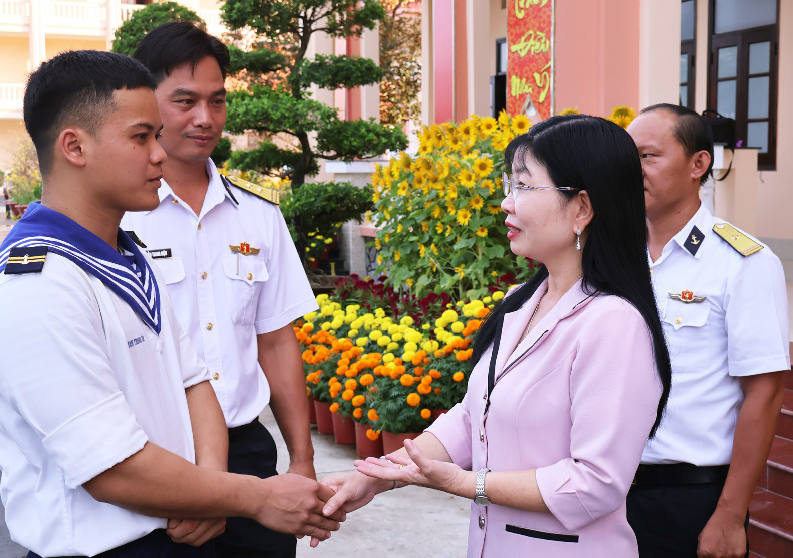Đồng chí Trần Thị Thanh Hương thăm hỏi, động viên chiến sĩ trẻ Lữ đoàn 962 khi các chiến sĩ làm nhiệm vụ, đón tết xa nhà.
