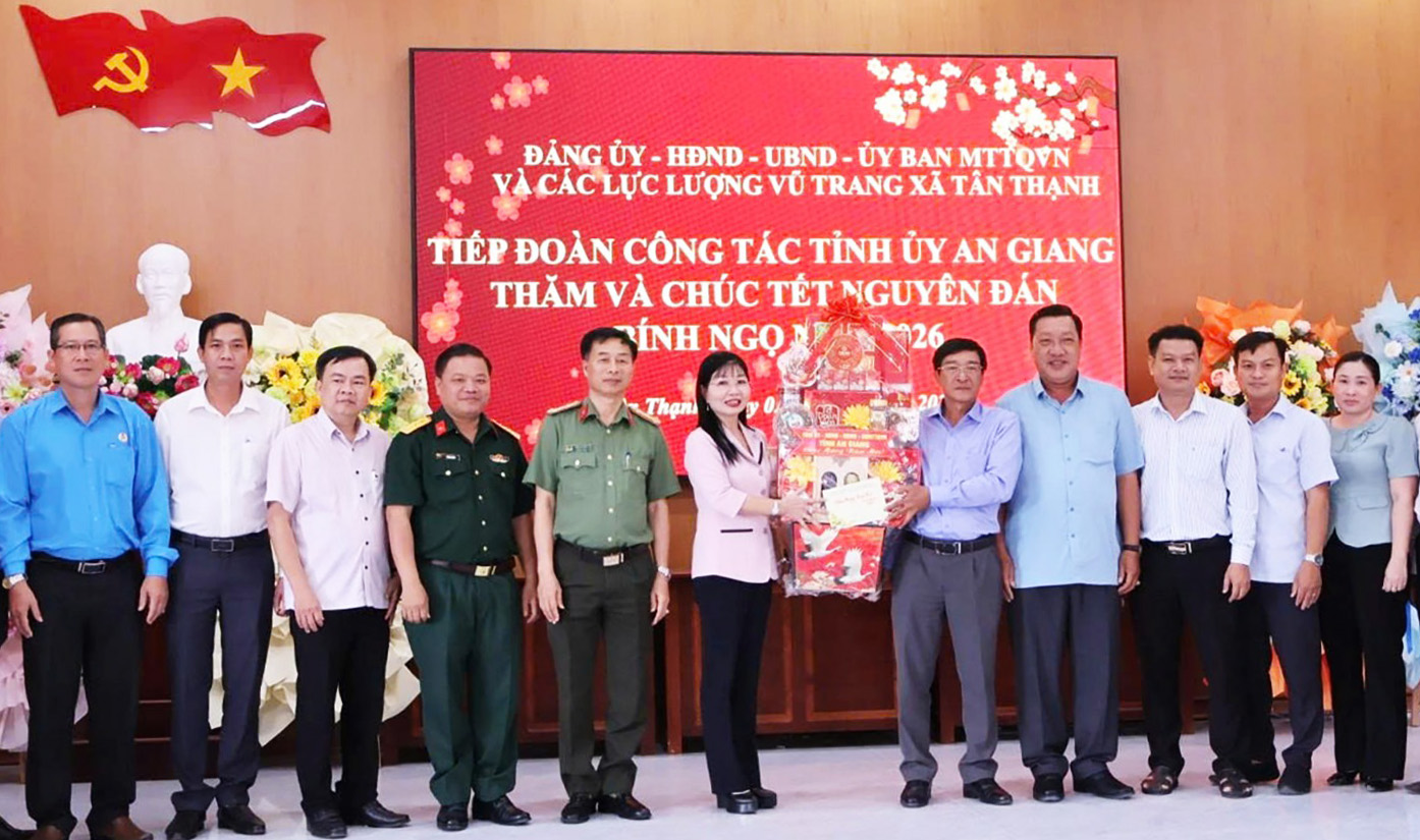Đồng chí Trần Thị Thanh Hương (thứ sáu, từ trái qua) cùng đoàn công tác của Tỉnh ủy, HĐND, UBND, Ủy ban MTTQ Việt Nam tỉnh An Giang chúc tết, tặng quà Đảng bộ, chính quyền và Nhân dân xã Tân Thạnh.
