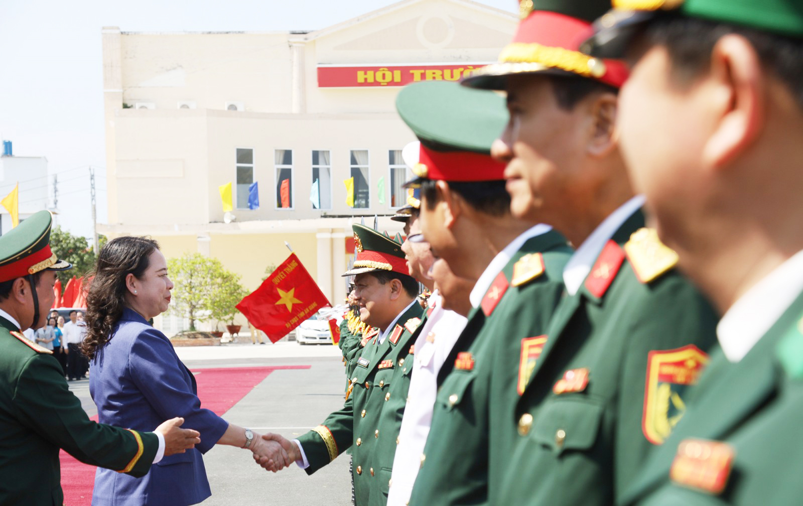 Phó Chủ tịch nước Võ Thị Ánh Xuân bắt tay Thiếu tướng Chiêm Thống Nhất, Ủy viên Ban Chấp hành Trung ương Đảng, Phó Tư lệnh kiêm Tham mưu trưởng Quân khu 9.