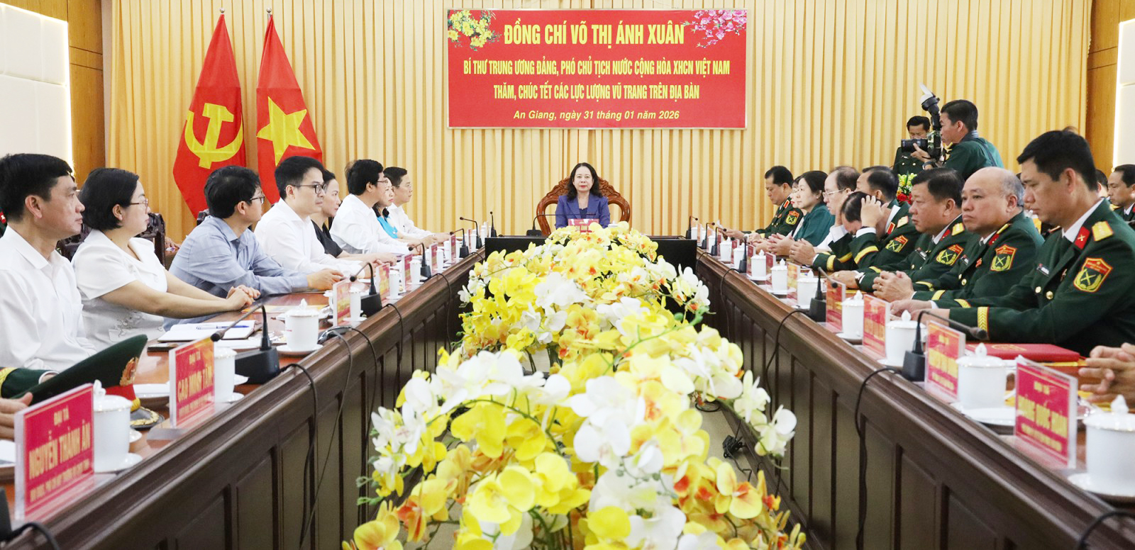 Nhân dịp năm mới Xuân Bính Ngọ 2026, thay mặt lãnh đạo Đảng, Nhà nước, Phó Chủ tịch nước Võ Thị Ánh Xuân gửi lời chúc mừng năm mới tốt đẹp nhất đến cán bộ, chiến sĩ các lực lượng vũ trang tỉnh An Giang; mong các đơn vị tiếp tục phát huy truyền thống đoàn kết, chủ động, sáng tạo, hoàn thành xuất sắc nhiệm vụ được giao, góp phần giữ vững môi trường hòa bình, ổn định để xây dựng và phát triển tỉnh An Giang ngày càng giàu đẹp.