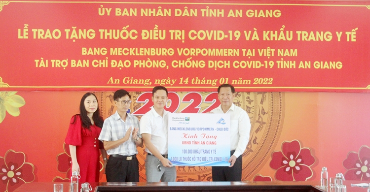 Dịp này, đại diện Bang Mecklenburg Vorpommem đã trao tặng tỉnh An Giang 100.000 khẩu trang y tế và 1.000 lọ thuốc hỗ trợ điều trị COVID-19.