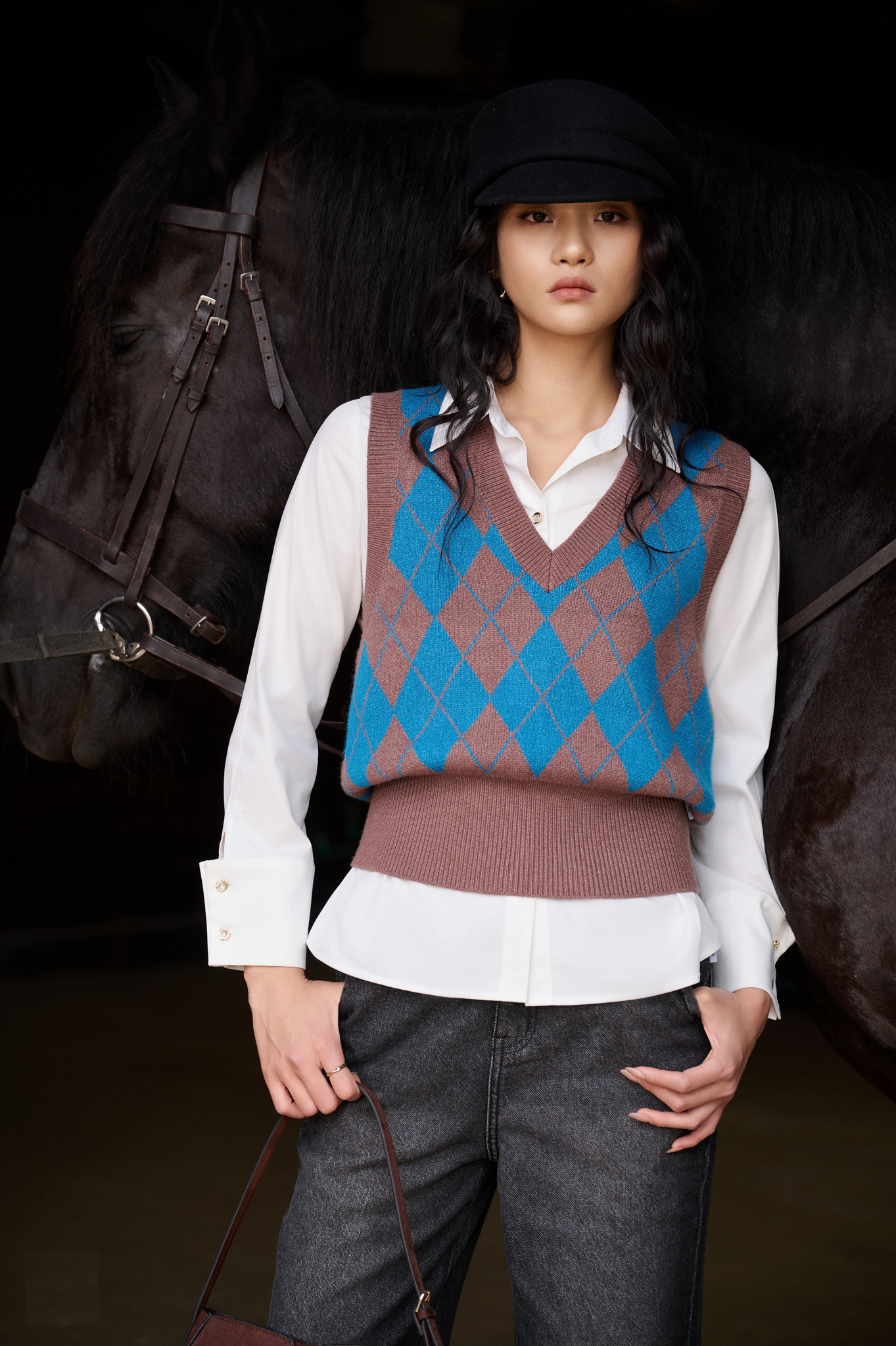 Áo len họa tiết kim cương, họa tiết kẻ ô vuông hay họa tiết ô quả trám luôn trở nên nổi bật, tương phản và tạo hiệu ứng thị giác mãn nhãn hơn khi mặc cùng áo sơ mi. ẢNH: DCHIC