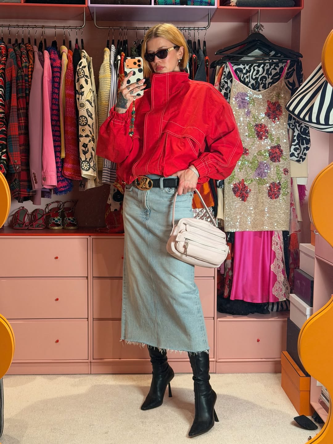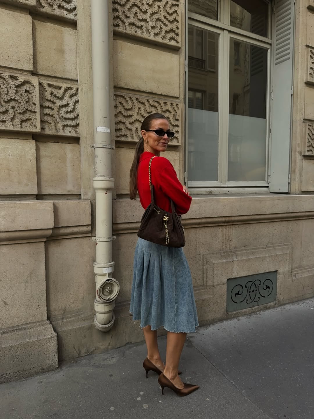 Phong cách đường phố kết hợp những yếu tố phổ biến nhất của thời trang công sở - áo dệt kim đỏ, chân váy denim dáng xòe và một đôi giày cao gót lụa satin mũi nhọn. ẢNH: JANKA POLLIANI