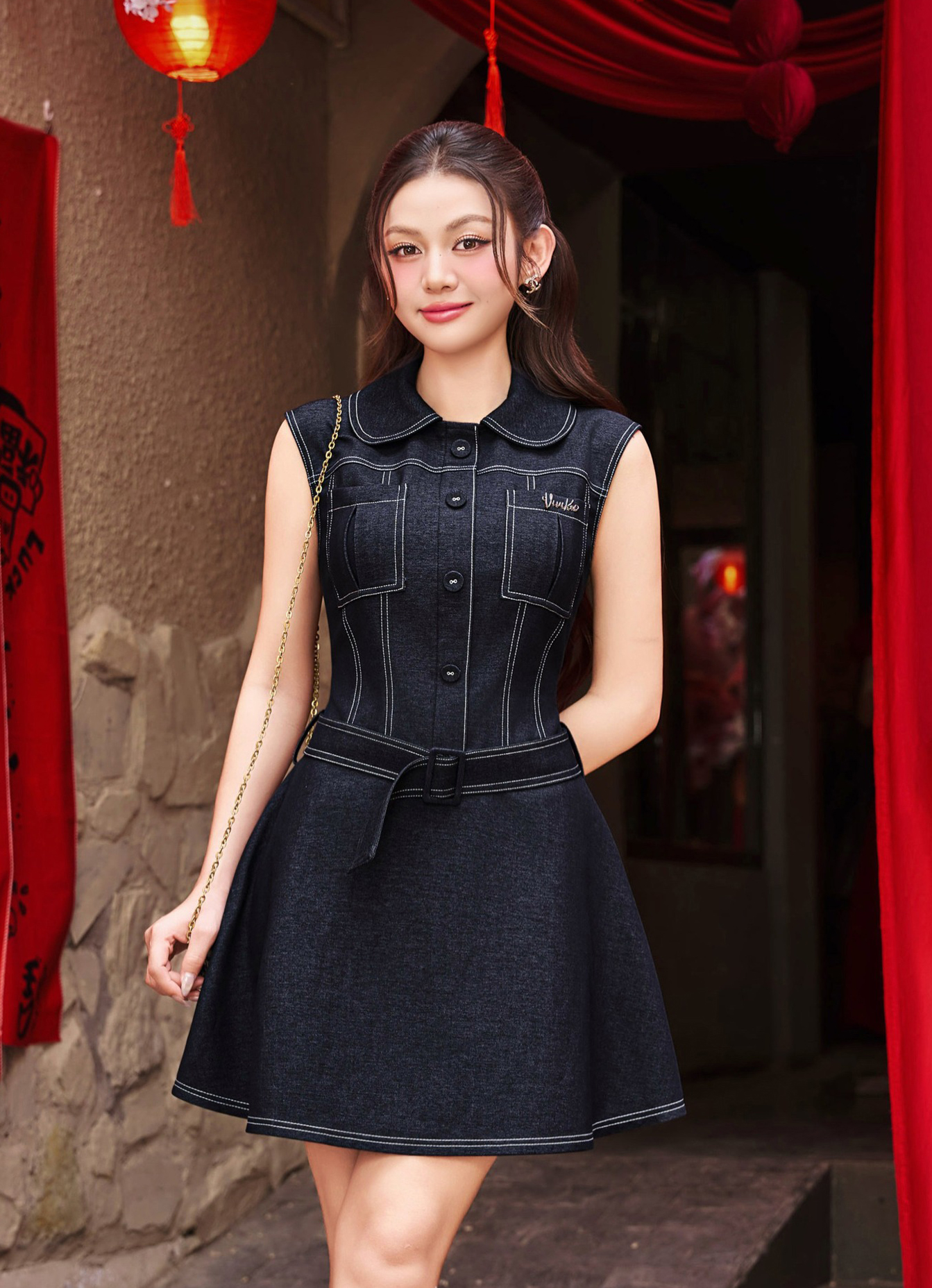 Đầm denim cổ sen tận dụng tối đa đường may chỉ trắng nổi bật trên nền vải xanh đen để tạo hiệu ứng thẩm mỹ và sự cuốn hút cho người mặc. ẢNH: VIVI KA