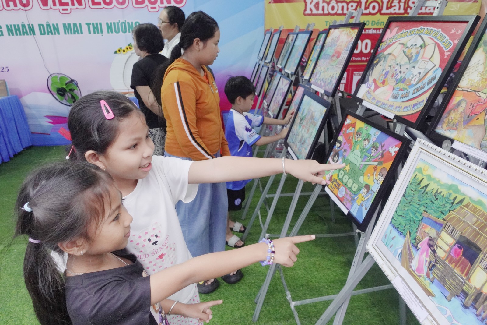 Các em thiếu nhi thích thú xem tranh vẽ.