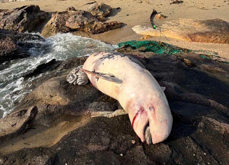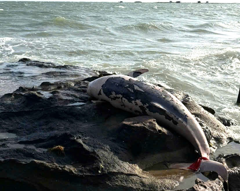 Thi thể cá heo trôi dạt nằm trên tảng đá ven bờ biển.