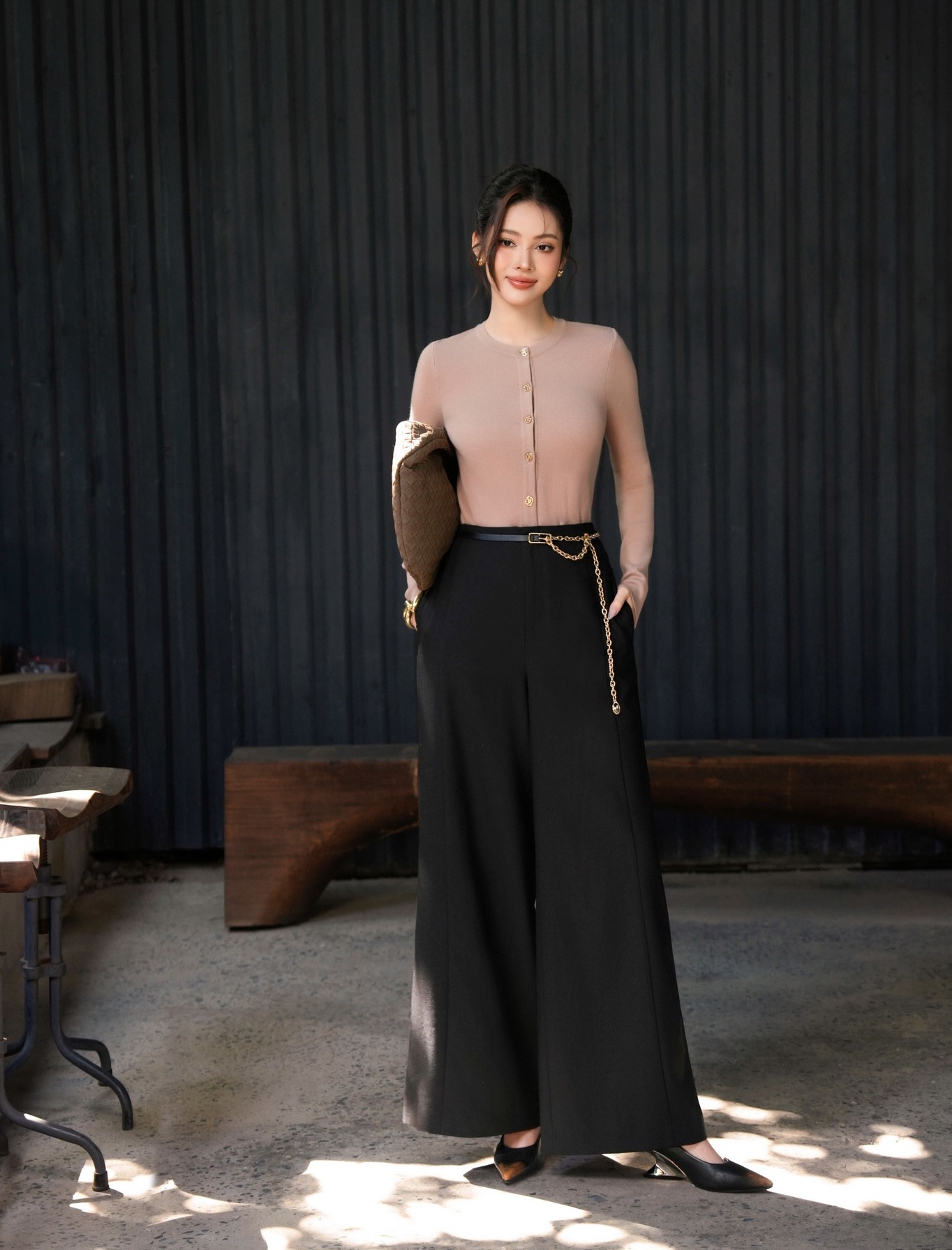Không cầu kỳ trong chi tiết, áo thun ôm sát ghi điểm với chất liệu mềm mại và gam be nâu tinh tế giúp làn da sáng hơn, dễ phối đồ và không bao giờ lỗi mốt. Trong khi đó, quần âu oversized có khả năng giấu khuyết điểm và hack dáng tối ưu. ẢNH: IVY MODA