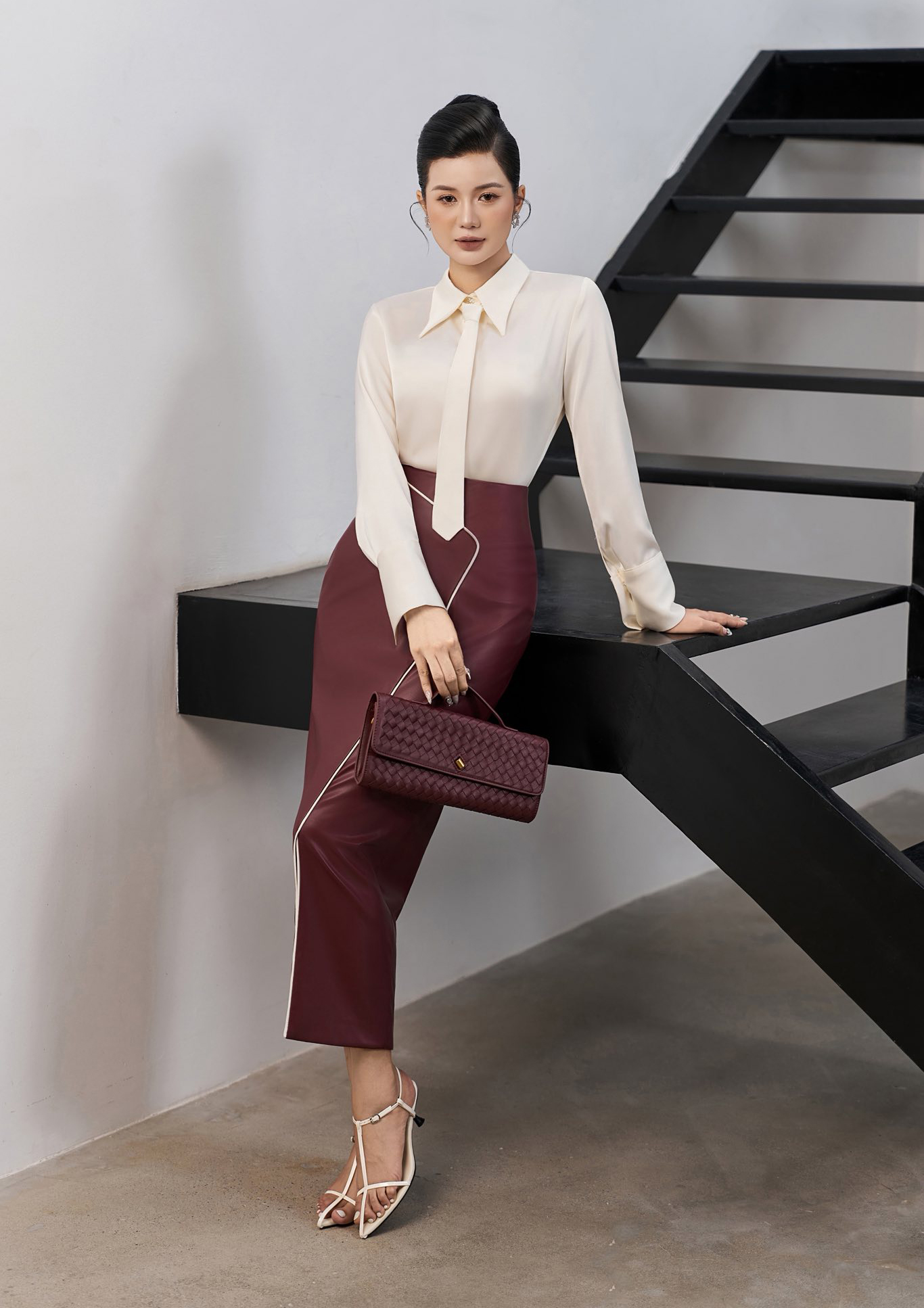 Khẳng định nét cá tính qua bản phối công sở độc đáo khi phối chân váy màu đỏ mận với đường kẻ họa tiết phá cách phối áo sơ mi màu cream kèm cà vạt. ẢNH: CHARLLOT