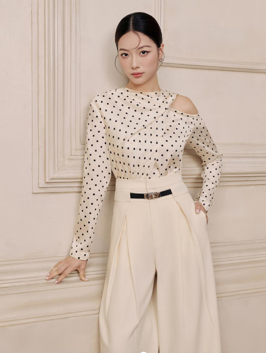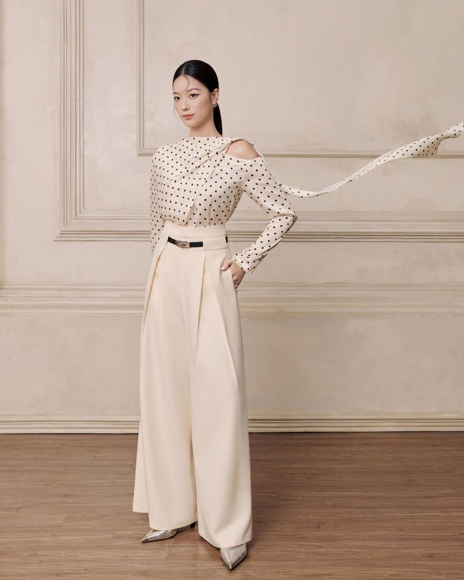Thu hút mọi sự chú ý khi nàng bước vào cùng diện mạo tươi sáng bừng sức sống. Điểm nhấn hở vai không hề làm mất đi nét kiêu sa từ cặp đôi quần ống rộng và giày cao gót mà còn tạo nên nét quyến rũ riêng cho bản phối có điểm nhấn là họa tiết chấm bi. ẢNH: ESMÉE