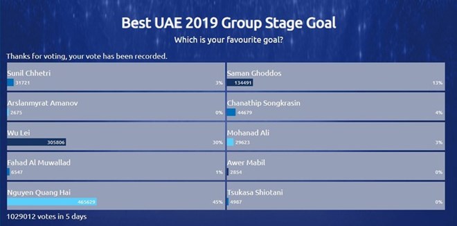 Nguyễn Quang Hải tiếp tục đón tin vui trước trận gặp Nhật Bản khi "siêu phẩm" của tiền vệ tuyển Việt Nam được người hâm mộ bình chọn là Bàn thắng đẹp nhất vòng bảng Asian Cup 2019.