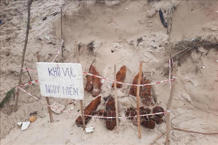 Theo đó, qua công tác tuần tra, kiểm tra nắm tình hình địa bàn sau mưa lũ, Tổ công tác Đồn Biên phòng Triệu Vân đã phát hiện tại khu vực bờ biển thôn 6, xã Triệu Cơ, tỉnh Quảng Trị có 8 quả bom mìn lộ thiên do mưa lũ làm sạt lở cát.