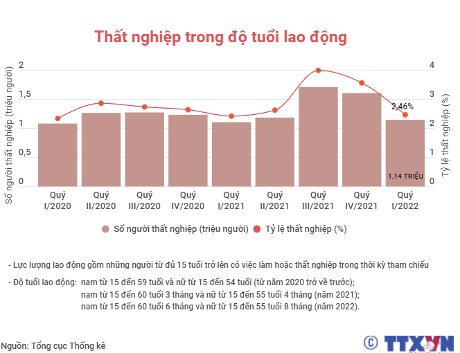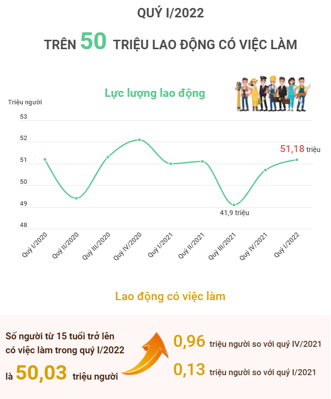 Quý I/2022, thị trường lao động đã dần hồi phục trở lại. Lực lượng lao động và số người có việc làm đều tăng so với quý IV/2021 và so với cùng kỳ năm trước. Trong khi đó, tỷ lệ thất nghiệp trong độ tuổi lao động đã giảm xuống.