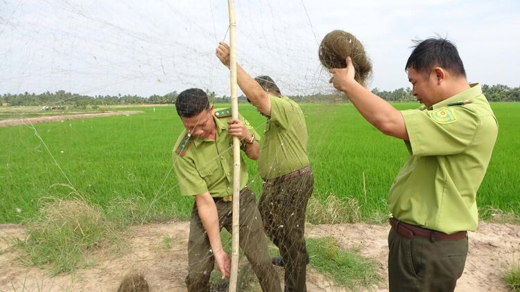 Kiểm lâm tỉnh tháo gỡ bẫy chim trời tại ấp Vĩnh Thành, xã Bình An.