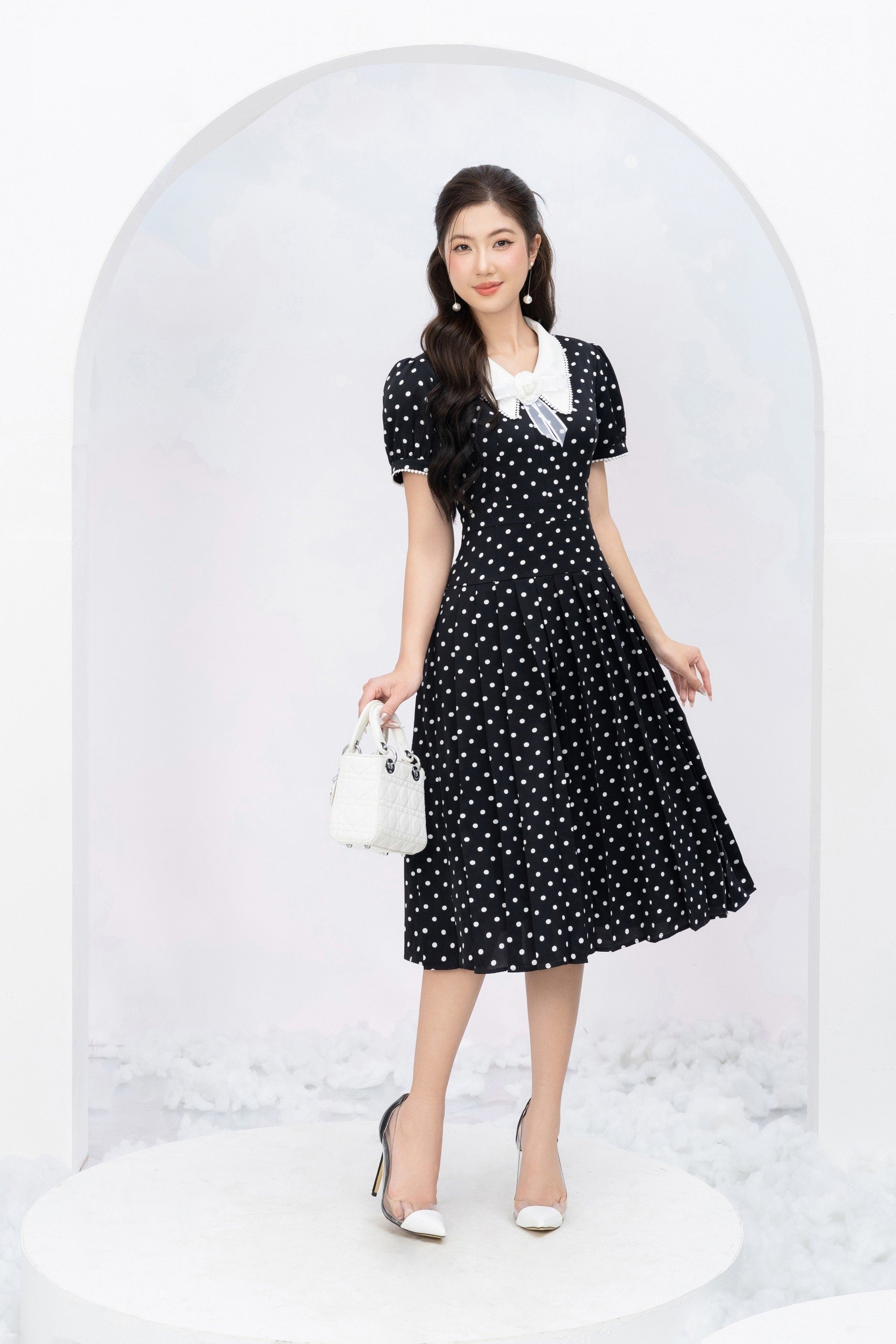 Khi được phối cùng phụ kiện tối giản và bảng màu trung tính, những chiếc váy họa tiết chấm bi mang đến hình ảnh chỉn chu và khẳng định gu thẩm mỹ riêng của người mặc trong khoảnh khắc giao mùa.