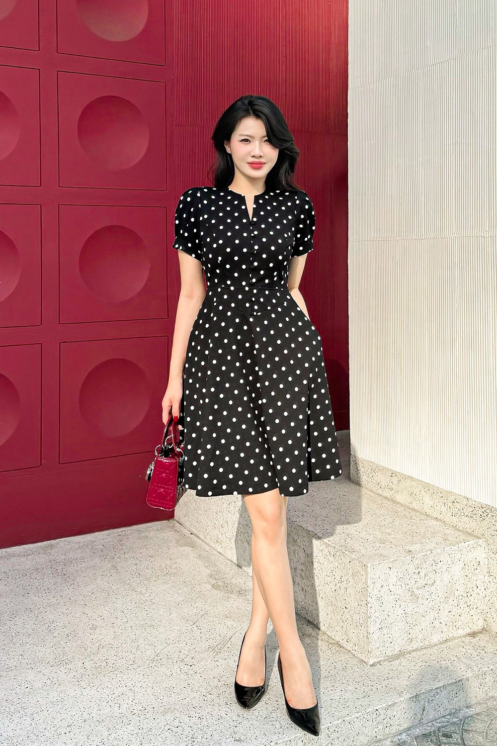 Xuất hiện trong chiếc đầm chấm bi dáng ngắn khoe trọn đôi chân dài thon gọn. Thiết kế cổ tròn cách điệu chữ V tạo khoảng hở nhỏ, phần chiết eo cùng tà váy xòe nhẹ mang tới diện mạo kiều diễm. Hoàn thiện bằng chiếc túi xách da tông đỏ cầm tay tương phản màu váy, thu hút mọi ánh nhìn. ẢNH: K&K FASHION