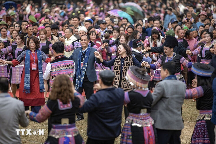 Các đại biểu và du khách cùng tham gia phần hội, nắm tay nhau nhảy quanh cây nêu theo điệu khèn Mông. (Ảnh: Trọng Đạt/TTXVN)