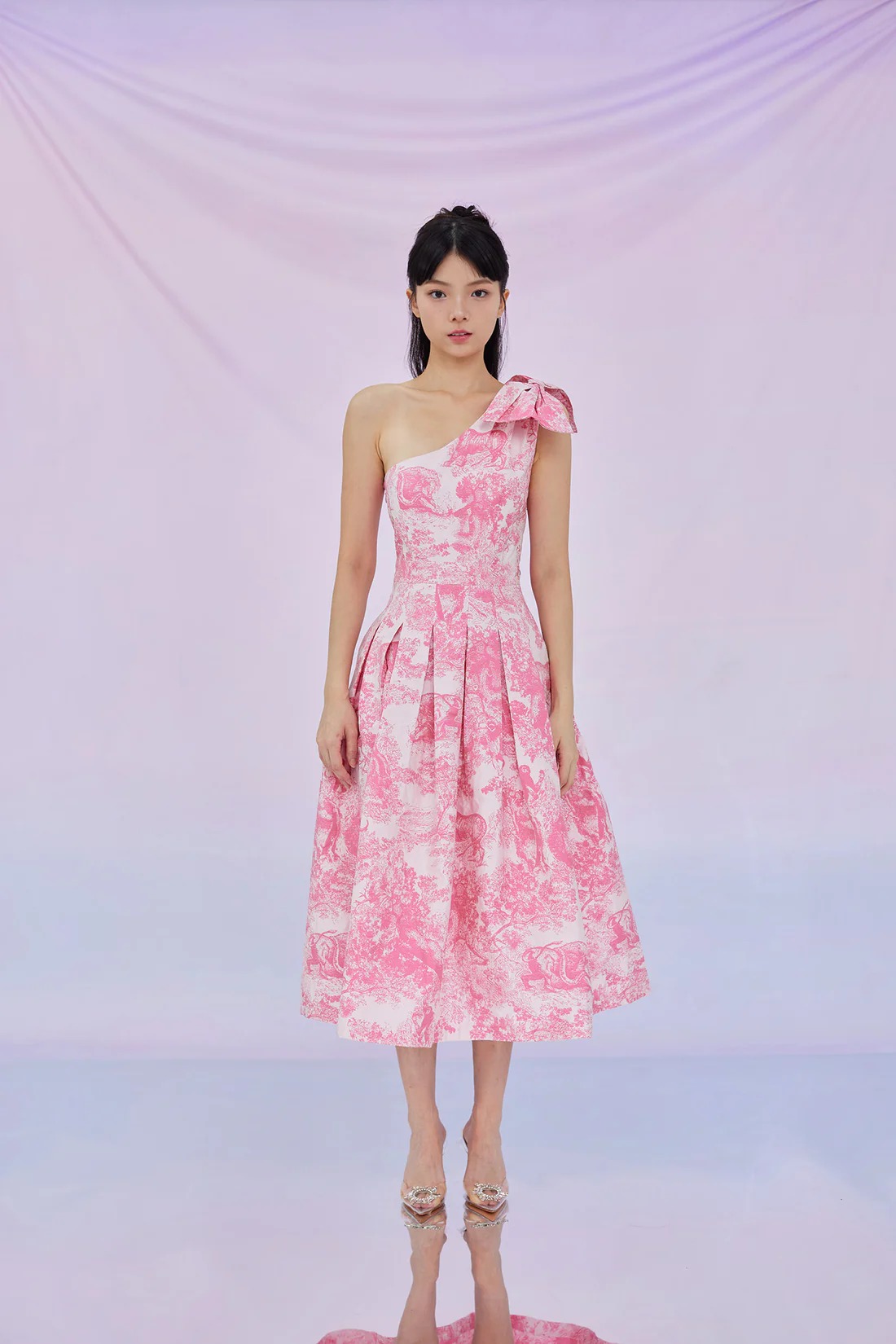 Thiết kế đầm lệch vai với họa tiết hồng nổi bật mang đến sự kết hợp thú vị giữa cá tính và nét mềm mại. Chiếc nơ lớn đặt trên vai kết hợp phần chân váy xòe nhẹ. Kiểu váy này có thể phối cùng xăng đan cao gót quai mảnh và túi xách mini tông trắng hoặc kem, tạo nên diện mạo vừa thanh lịch vừa thu hút ánh nhìn. ẢNH: NIMISSKI