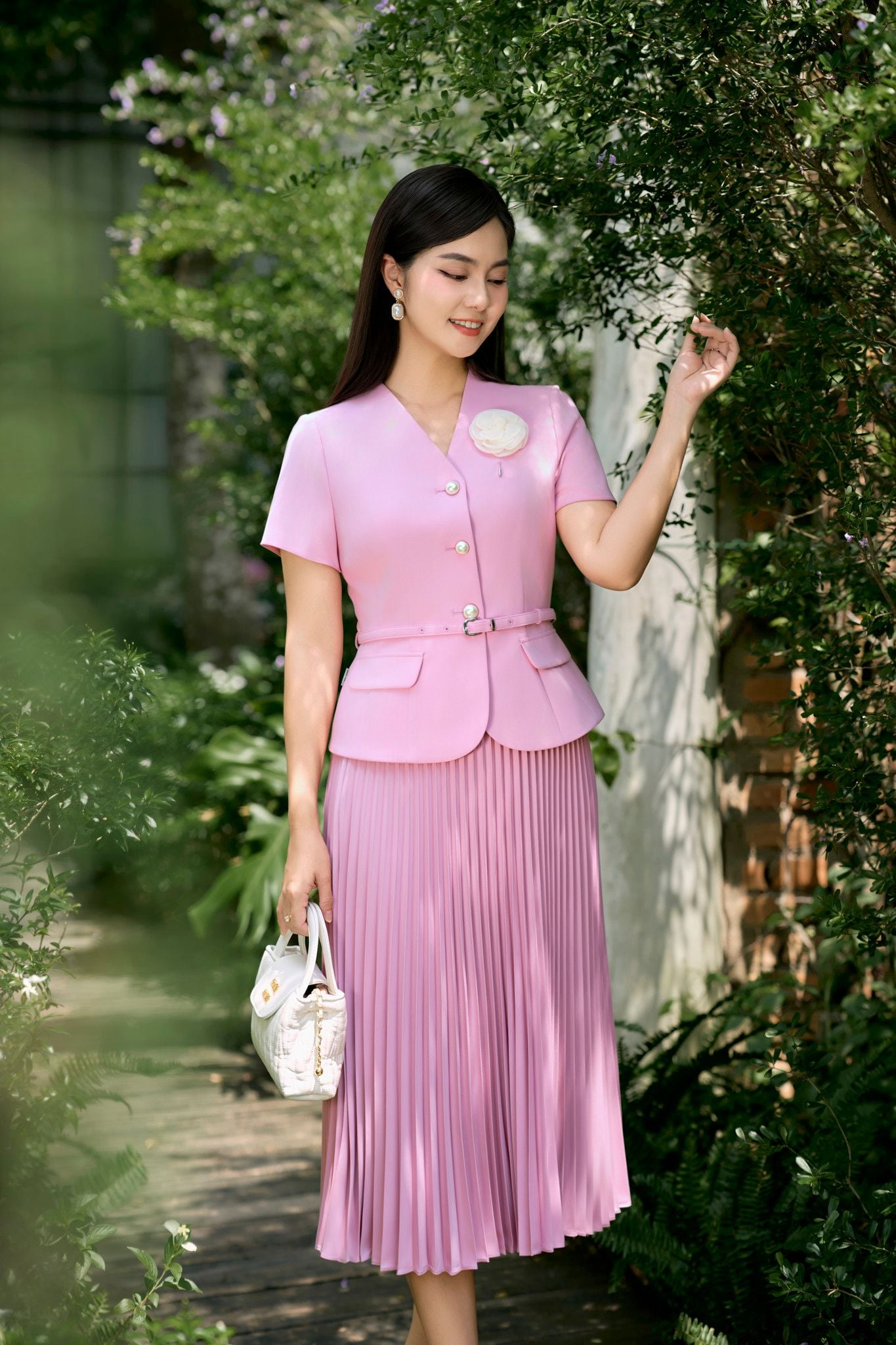 Set suit hồng với thiết kế áo cổ chữ V được điểm xuyết bằng hàng cúc kim loại tinh tế. Phần chân váy midi xếp ly rủ phối cùng giày cao gót tông trung tính và một chiếc túi xách da nhỏ gọn, bộ trang phục trở thành lựa chọn hoàn hảo cho những buổi gặp gỡ hoặc môi trường công sở chuyên nghiệp. ẢNH: CHIC LAND