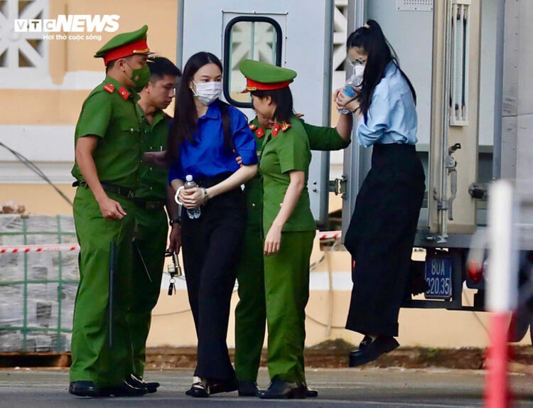 Bị cáo Nguyễn Thúc Thùy Tiên (áo xanh) và bị cáo Nguyền Thị Thái Hằng - Hằng Du Mục (áo trắng) được áp giải tới phiên tòa. (Ảnh: Hoàng Thọ)