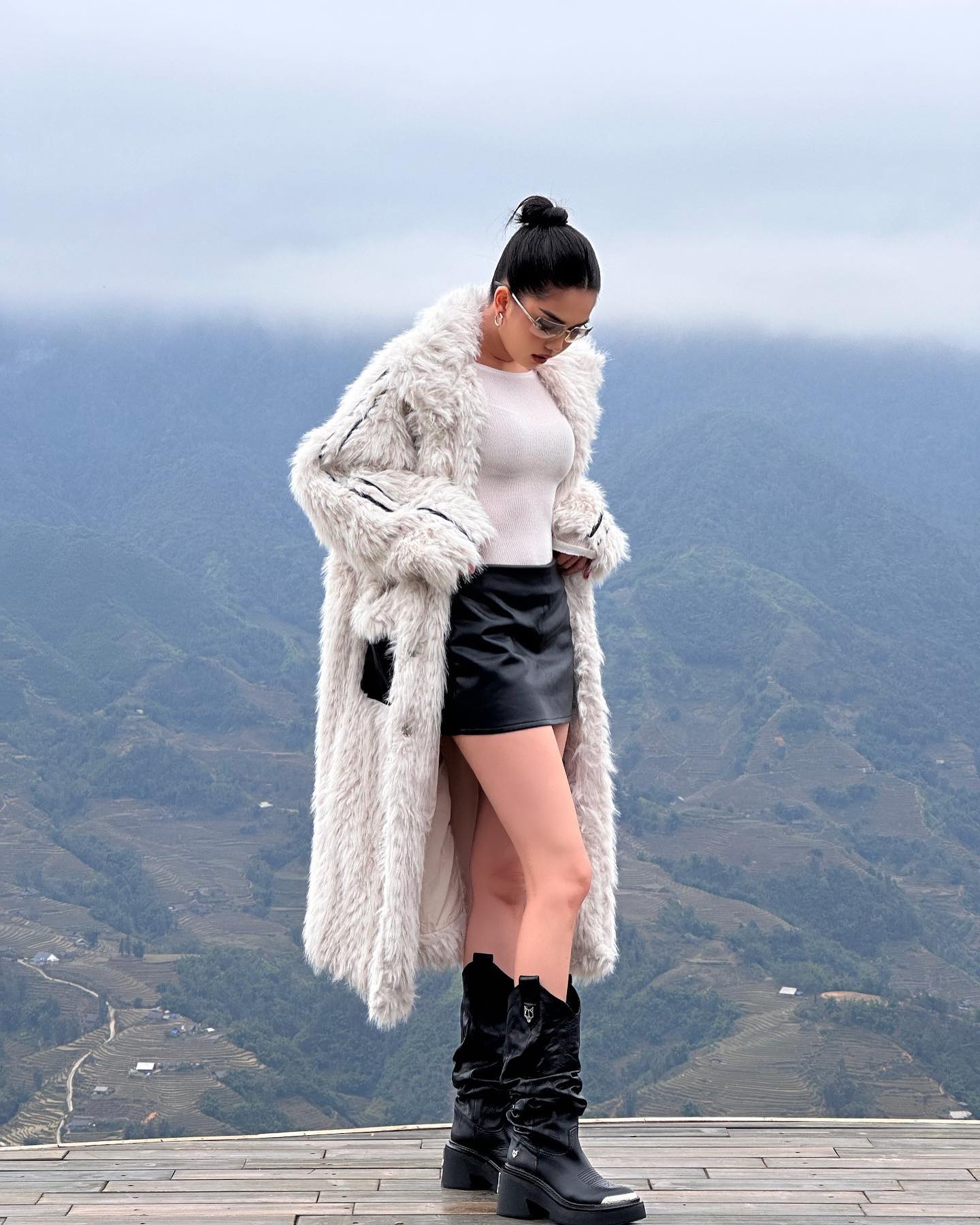Áo khoác lông ngắn phối cùng bốt lông mang đến phong cách cá tính, phù hợp với những cô nàng yêu thích phong cách thời trang nổi bật. ẢNH: @NEWYNNI