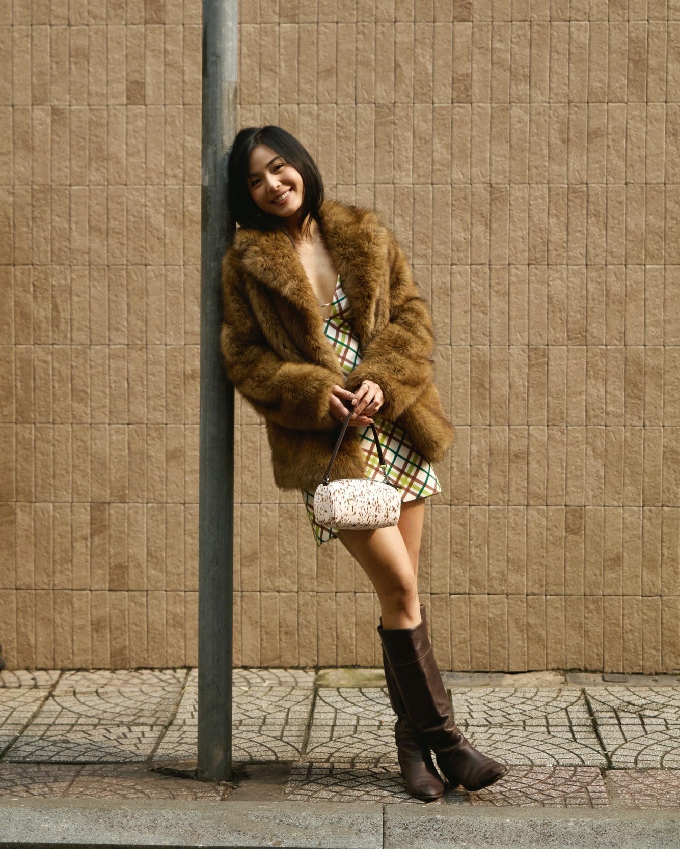 Những năm gần đây phong cách retro đang quay trở lại mạnh mẽ trong những mùa lạnh, đặc biệt khi được làm mới bằng các chất liệu sang trọng như lông nhân tạo và da. Một chiếc áo khoác lông màu nâu mang hơi thở cổ điển nhưng không hề cũ kỹ khi được đặt trong tổng thể phối đồ cân đối, chất liệu lông bồng bềnh giúp tạo hiệu ứng thị giác mềm mại, đồng thời mang đến cảm giác ấm áp và đẳng cấp. Việc kết hợp cùng đầm ngắn họa tiết ca rô nhiều màu gợi nhớ đến thời trang thập niên cũ, giúp tổng thể trở nên sinh động và giàu cá tính hơn.