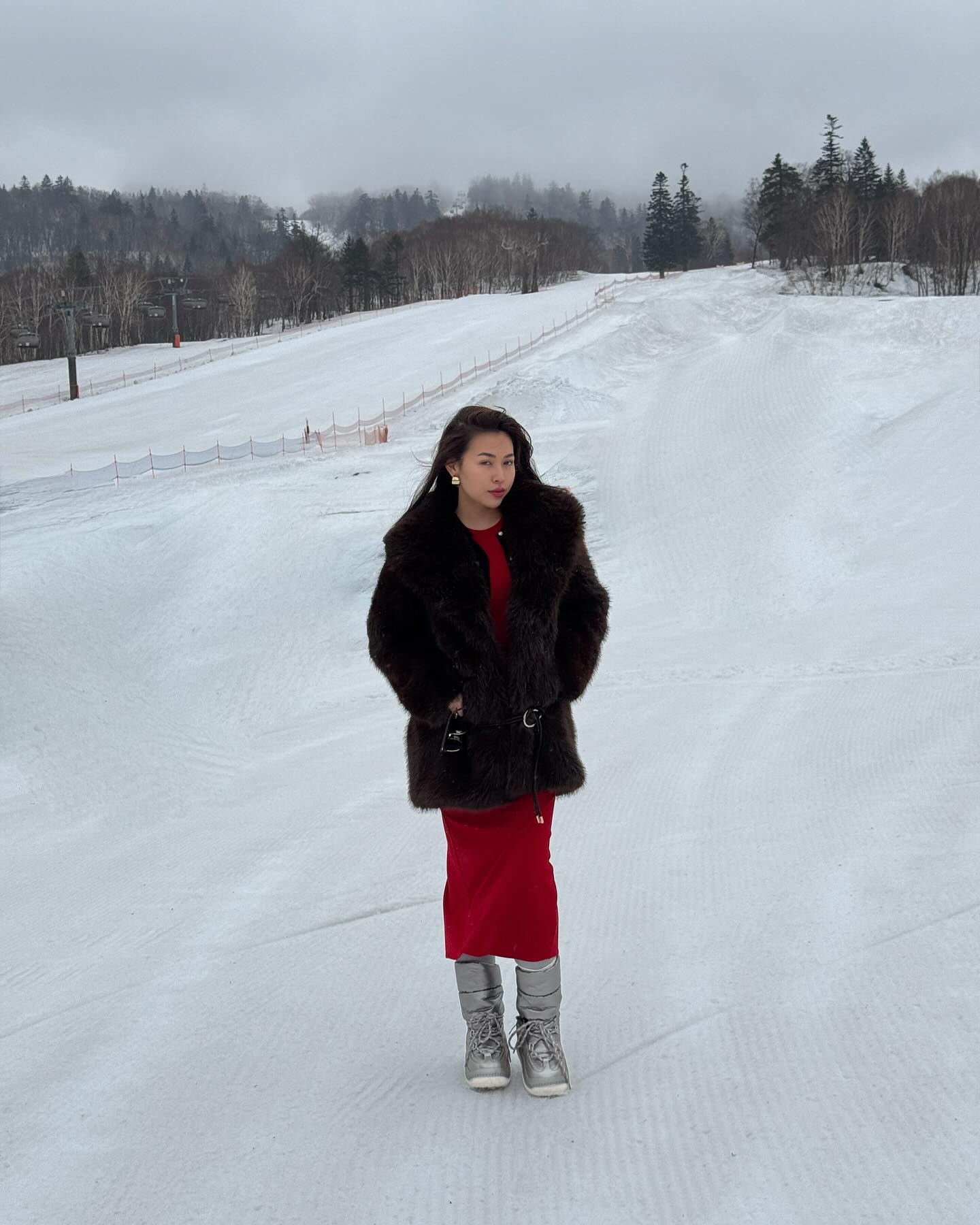 Áo khoác lông màu nâu kết hợp váy đỏ nổi bật và bốt ánh kim tạo nên tổng thể sang trọng, nổi bật giữa mùa đông. ẢNH: @NEWYNNI