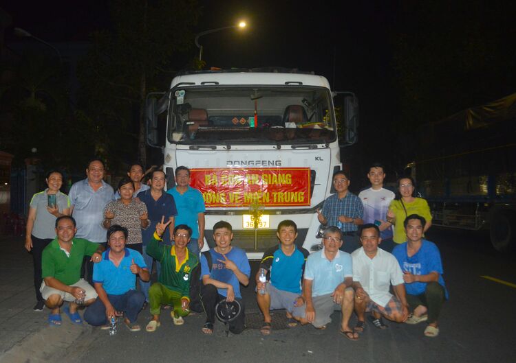 Cán bộ, nhân viên Sở Y tế tỉnh An Giang đưa hàng hóa lên xe xuất phát hỗ trợ đồng bào bị bão lũ Khánh Hòa. Ảnh: MINH HẢI