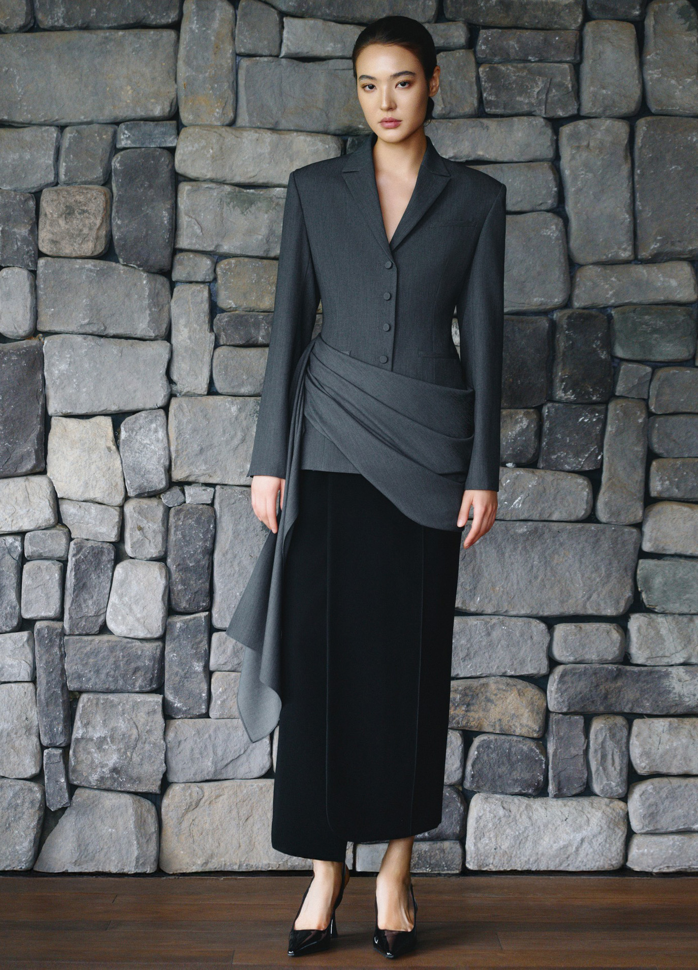 Chân váy dài càng không thể không diện cùng giày cao gót. Slingback màu đen hoàn hảo cho bản phối váy nhung đen vạt lệch phối áo vest xám cách điệu. ẢNH: LAM.D STUDIO