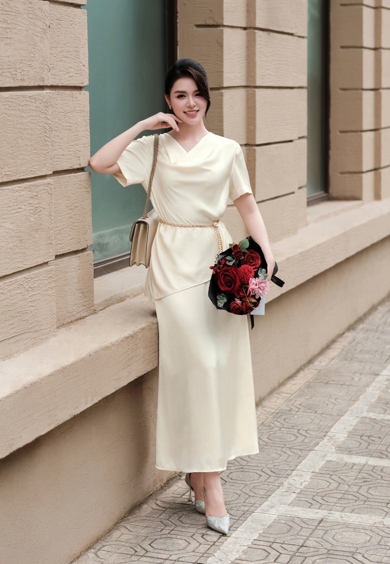 Chiếc áo lụa sắc be cổ chữ V được chiết đai khéo léo giúp tôn lên đường nét mềm mại của vóc dáng. Kết hợp cùng chân váy lụa dáng dài tone sur tone, điểm nhấn tinh tế nằm ở chiếc túi xách đeo vai với quai lồng dây xích mạ đồng, tạo hiệu ứng bắt sáng đầy tinh tế. Hoàn thiện bản phối bằng giày cao gót mũi nhọn dễ dàng ghi dấu ấn với vẻ ngoài thanh tao. ẢNH: CHARMILLES
