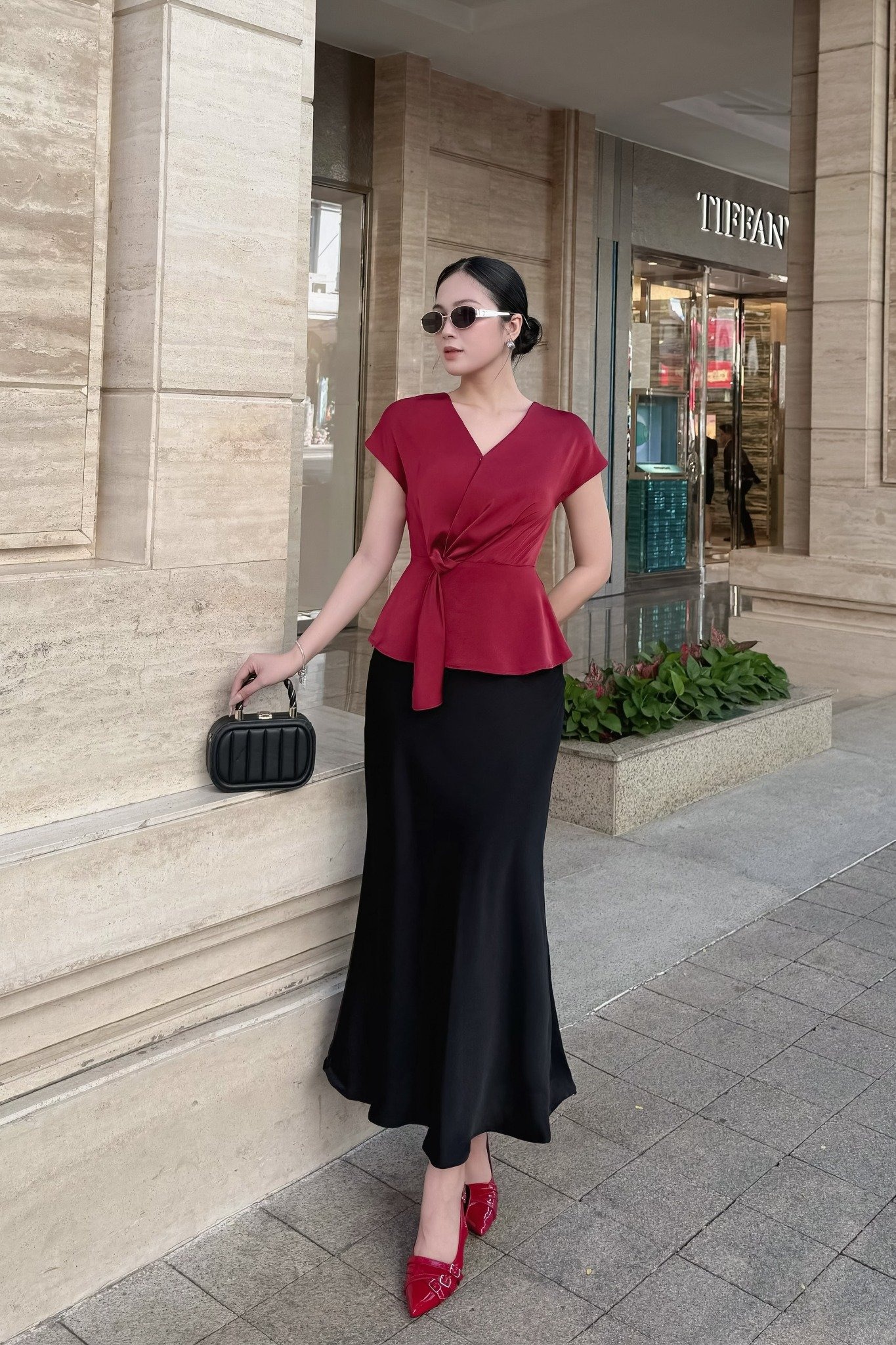 Ghi dấu ấn với áo lụa chiết đai sắc đỏ với thiết kế cổ chữ V khéo léo tôn lên vóc dáng thon gọn. Phối cùng chân váy lụa đuôi cá tông đen làm nổi bật vẻ trang nhã. Điểm xuyết bằng túi xách cầm tay dáng hộp dễ dàng mang lại nét chỉn chu, hiện đại cho bản phối. ẢNH: @MAYBI_OFFICIAL