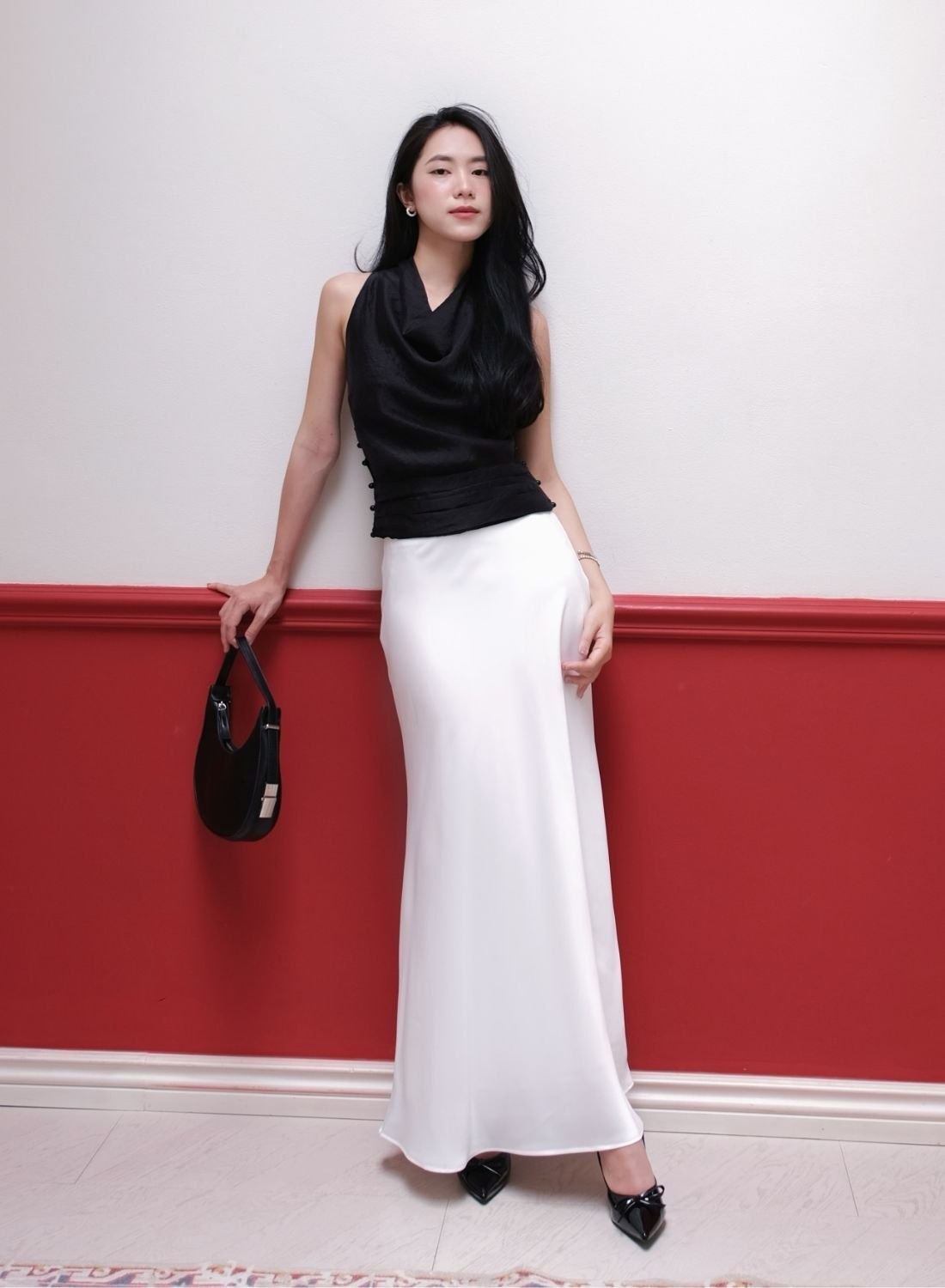 Áo lụa đen sát nách với thiết kế cổ đổ mềm mại và chiết đai tinh tế, khéo léo phối cùng chân váy lụa dáng dài sắc trắng, làm nổi bật nét trang nhã. Điểm nhấn của bản phối nằm ở túi xách bán nguyệt sắc đen cầm tay, góp phần tôn lên khí chất thời thượng của người mặc. ẢNH: @LABOUTIQUE.VN