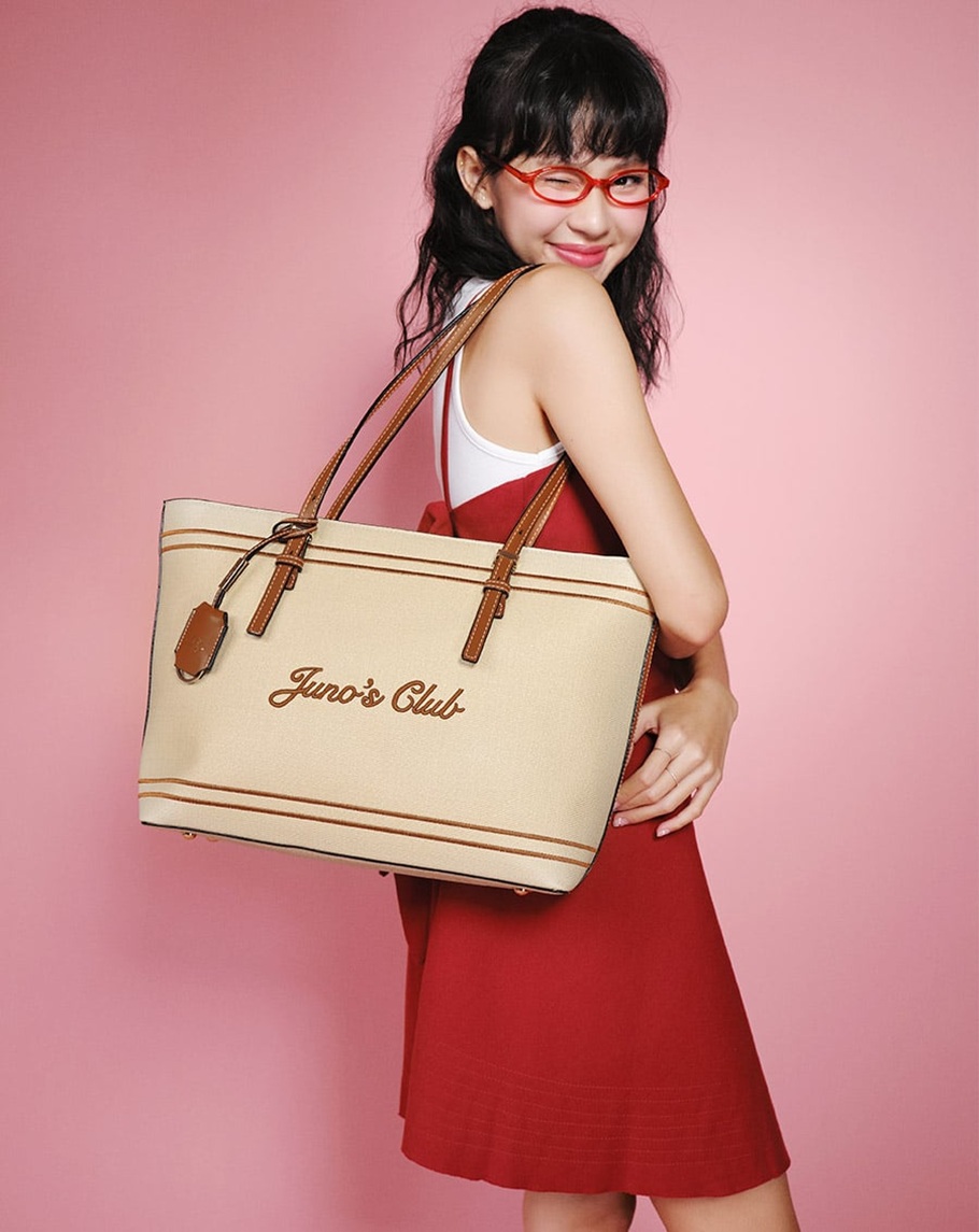 Túi tote sắc nâu be phủ bóng nhẹ, bề mặt thêu chữ dập nổi cùng đường chỉ thẳng tắp mang đến cảm giác cao cấp và tinh tế. Khi phối cùng áo polo đen gọn gàng và chân váy xếp ly ngắn, tổng thể trang phục vừa trẻ trung vừa giữ được nét thanh lịch. Chiếc túi với phom dáng cứng cáp trở thành điểm tựa hoàn hảo, tôn lên vóc dáng yêu kiều của người mặc. ẢNH: @JUNO.VN