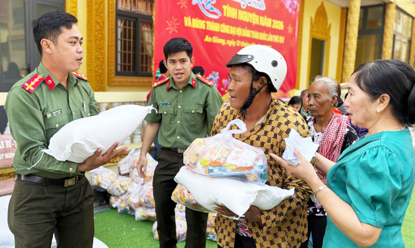 Tại chương trình, Phòng An ninh nội địa Công an tỉnh An Giang trao 300 phần quà cho các hộ có hoàn cảnh khó khăn và đồng bào dân tộc thiểu số dịp Tết Nguyên đán Bính Ngọ 2026, trong đó 150 suất được trao tại xã Mỹ Thuận và 150 suất tại xã Kiên Lương.