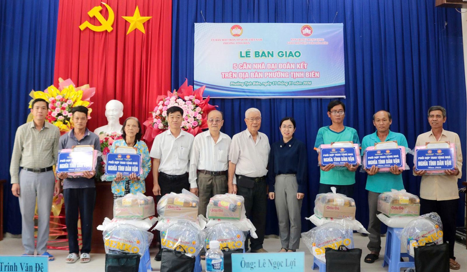 Dịp này, chính quyền địa phương và Ban Trị sự Trung ương Giáo hội Phật giáo Hòa Hảo tặng mỗi gia đình 1 phần quà trị giá 1 triệu đồng.