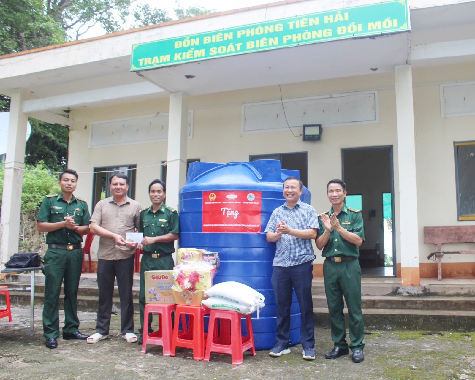 Đoàn công tác tặng quà, bồn đựng nước cho Trạm Kiểm soát Biên phòng Đồi Mồi.