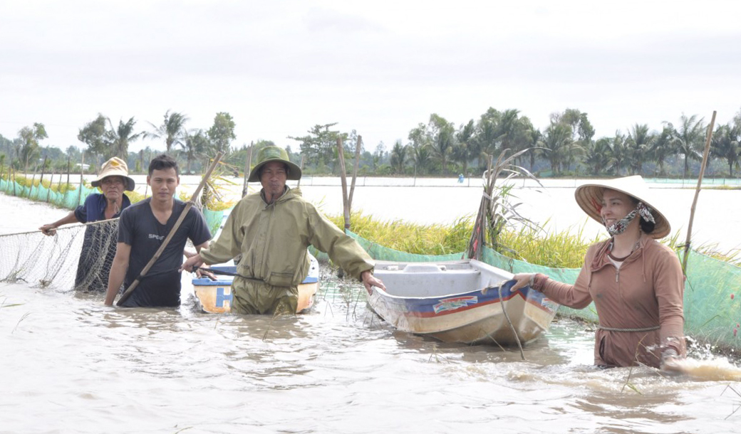 Người dân tận dụng cánh đồng ngập lũ ở ấp Danh Thợi để nuôi cá.