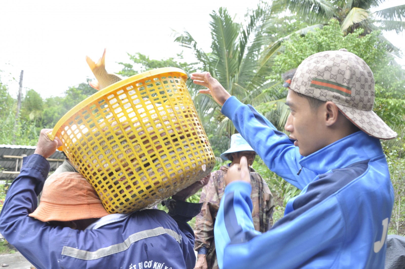 Người dân thả cá chép và cá mè vào đầu mùa lũ, con giống do thương lái cung cấp và cam kết thu mua. Khi thu hoạch, các hộ "vần công" kéo cá, tiết kiệm chi phí thuê nhân công.