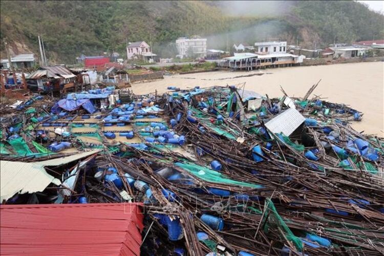 Mưa lũ gây thiệt hại nặng nề các lồng bè nuôi trồng thủy sản tại tỉnh Đắk Lắk. Ảnh: TTXVN
