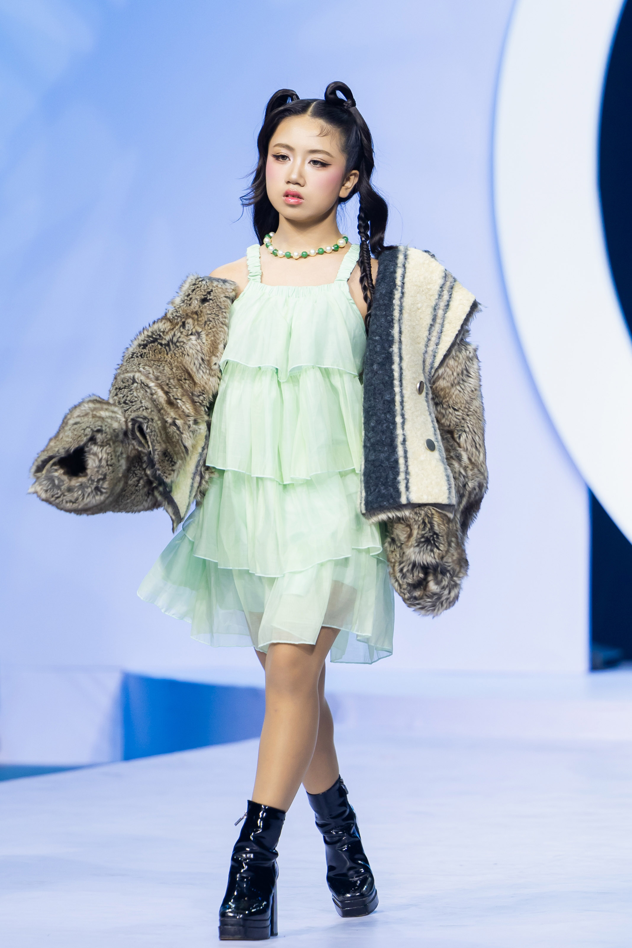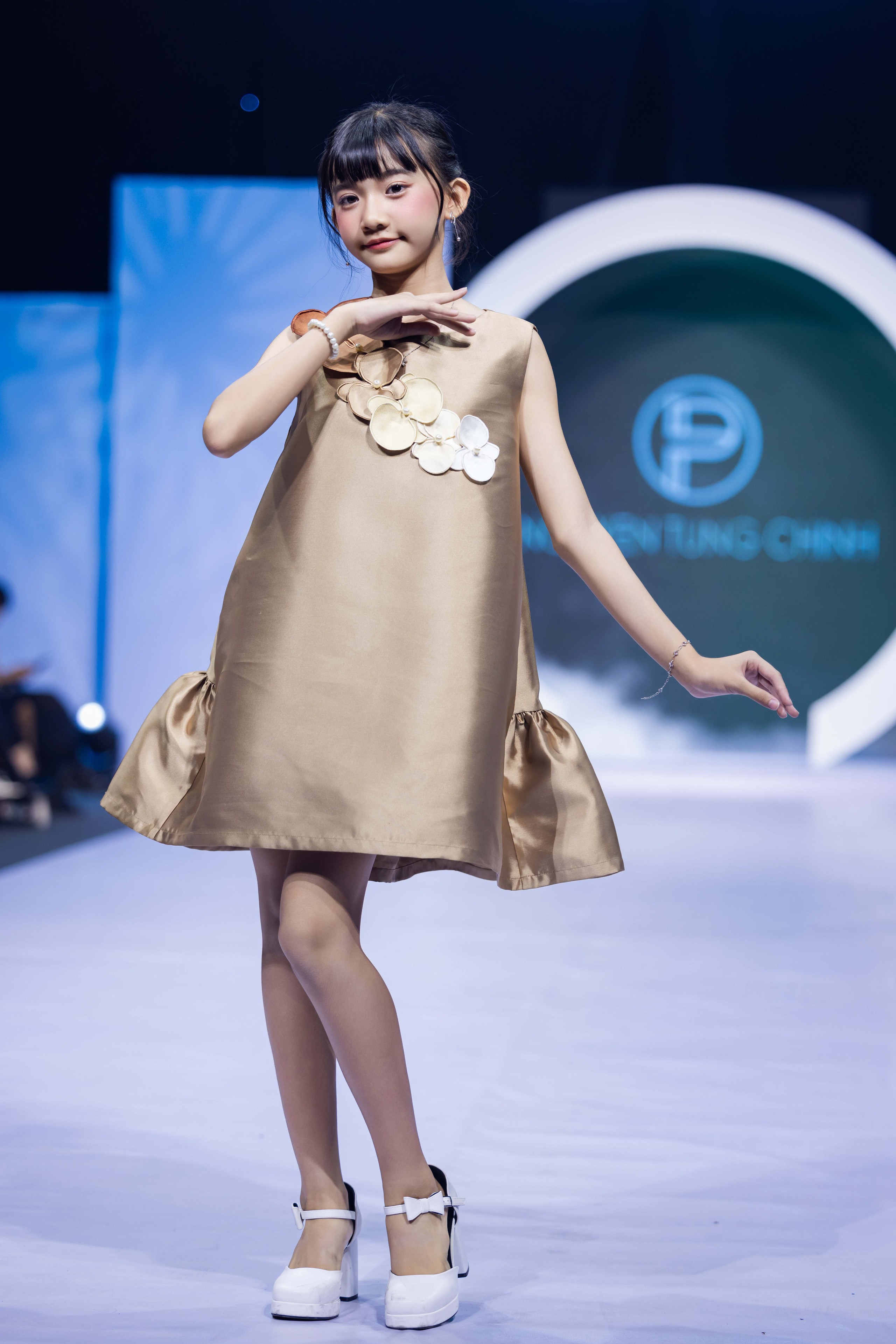 Người mẫu nhí tạo dáng tự nhiên khi giới thiệu thiết kế nằm trong BST của NTK Nguyễn Tùng Chinh. ẢNH: VIỆT TRUNG