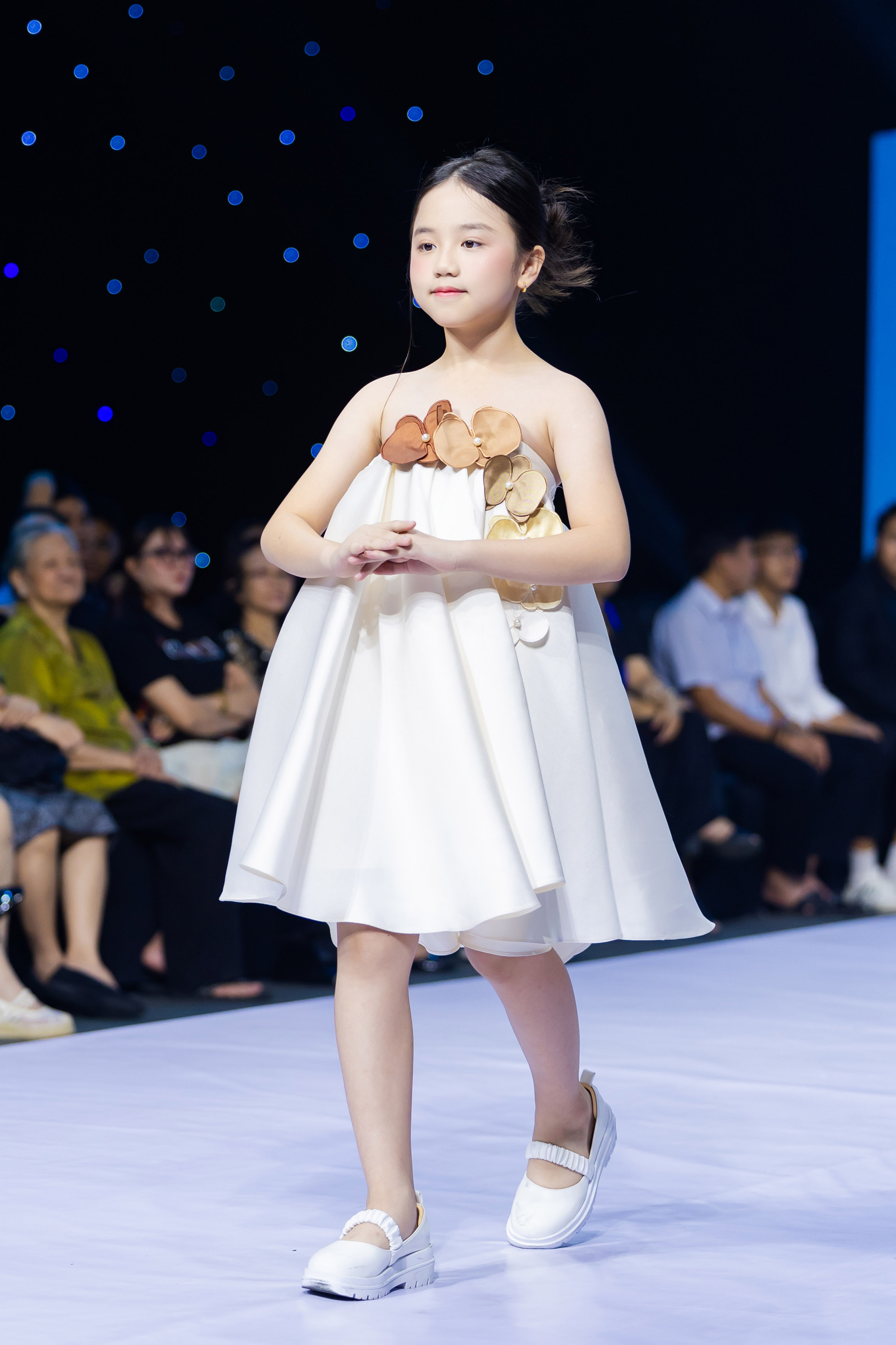 Các mẫu nhí đem đến sàn diễn thời trang nét diễn ngây thơ đáng yêu, thu hút sự chú ý của khán giả. Các thiết kế đến từ NTK Cẩm Duyên và NTK Thanh Liễu (trái qua phải). ẢNH: VIỆT TRUNG