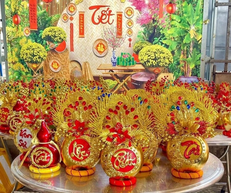 Những ngày cận tết, khi thị trường quà biếu và đồ chưng tết sôi động, dừa dát vàng là một trong những mặt hàng độc lạ, mang ý nghĩa phong thủy, được nhiều gia đình lựa chọn để bày mâm ngũ quả hoặc làm quà tặng. Từ những trái dừa quen thuộc của miền Tây, qua nhiều công đoạn thủ công, người thợ phủ lên lớp vàng công nghiệp 24K, kết hợp trang trí chữ, hoa văn… tạo nên sản phẩm có giá từ vài trăm nghìn đến vài triệu đồng.